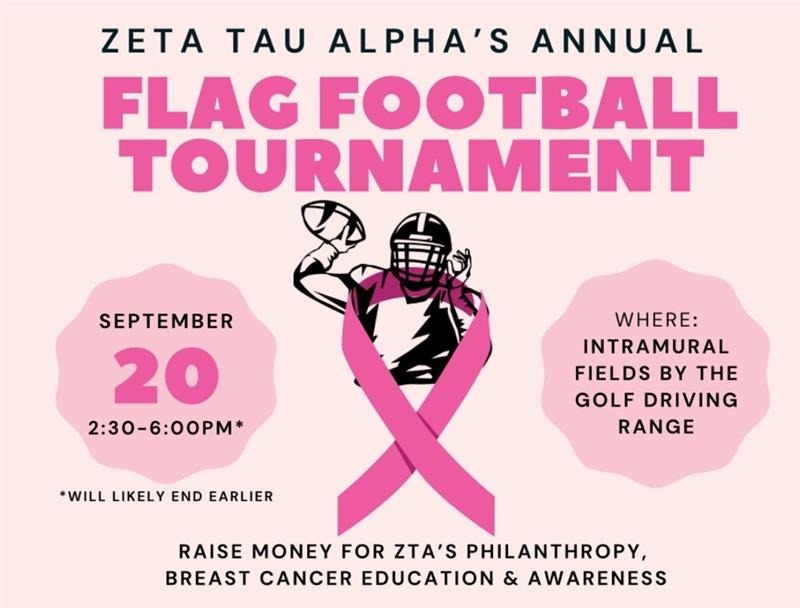 Elected into the role of Philanthropy Assistant on my sorority's program council, I wore many hats in the coordination of our various fundraising and philanthropic events around campus. Our philanthropy, Breast Cancer Awareness and Education, is one I hold very close to my heart, so I was honored to create meaningful and impactful design work for two of our biggest events: Flag Football and Think Pink Week. I designed banner templates in Canva, social media flyers to generate interest and participation, and additional decor details like floral bouquet tags and signage.